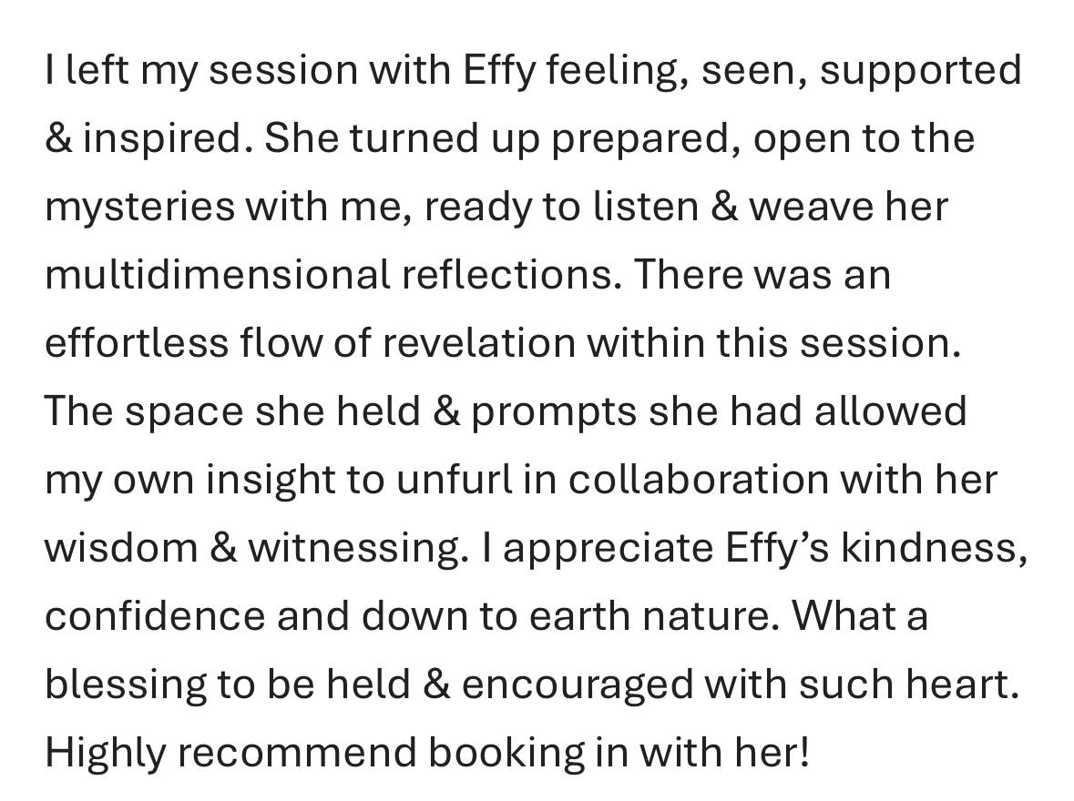 You feel safe to speak your truth and share exactly how you feel without judgement. The realisations and wisdom you receive reflected back to you. The shifts and aha moments that happen in the moment and throughout your life. You notice how your thoughts and reactions have changed. Your whole perception changes - you don't take things personally and you know everything is happening FOR you. You have someone who sees your full potential and encourages you to go for what you really want!!! And who celebrates every single step along the way.