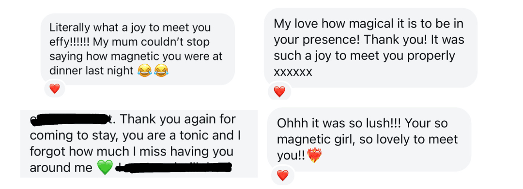 I am the embodiment of what I teach, with multiple people sharing how magnetic I am! This hasn't ALWAYS been the case, I used to blend into the background, I didn't know my worth and I wasn't confident - now I OWN who I am, I know her, I love her, I rate her and I magnetise people to me easily by literally being myself